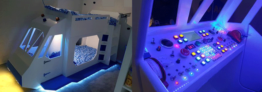 Das Stockbett hat ein Cockpit mit vielen bunten und funktionierenden Knöpfen, und ein Raspberry Pi macht das ganze mit Sound-Effekten noch perfekt.